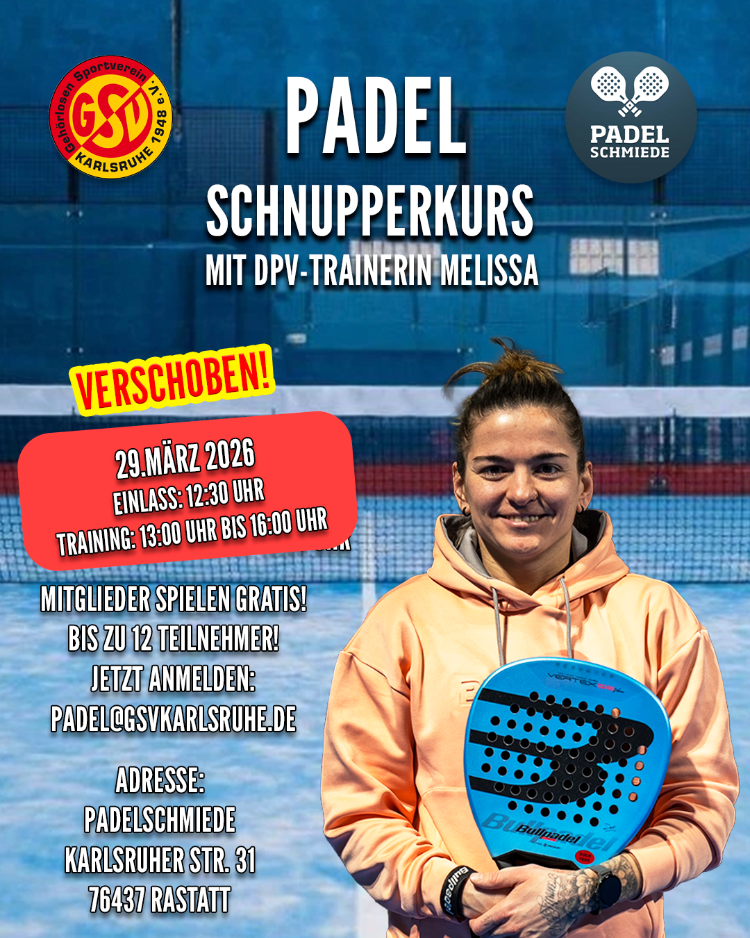 Der ursprünglich geplante Schnupperkurs am 15.03. muss leider aufgrund eines organisatorischen Fehlers seitens der Padelschmiede bei der Platzbuchung abgesagt werden.